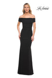 Beaded jersey gown with ruched off the shoulder top. Back zipper closure.