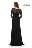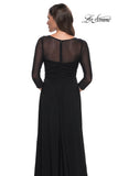 Long chic evening dress with illusion neckline and three quarter sleeves. Ruching on the bodice and draped detail on the skirt. Back zipper closure.