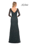 Fitted long lace dress with high neckline and illusion three-quarter sleeves. V back with back zipper closure.