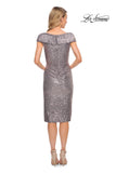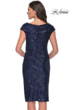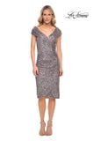 Sequin off the shoulder below-the-knee gown with ruching. Back zipper closure.