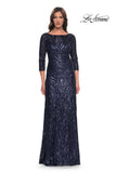 Elegant long dress with pretty sequin print design. High neckline and three quarter sleeves. Back zipper closure.