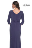 Simple long jersey evening dress with high neckline and three quarter sleeves. Flattering ruching along the waist and ruffle detail on the skirt. Back zipper closure.