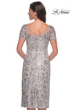Short lace sequin dress with illusion neckline and beading along the top. Back zipper closure.