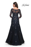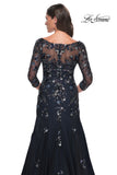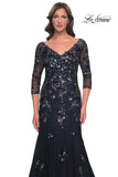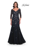 Mermaid gown with sequin lace applique cascading down the skirt. V neckline and sheer three quarter sleeves. Back zipper closure.