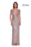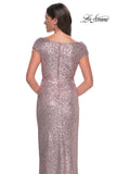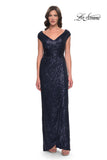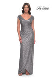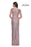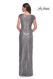 Chic sequin dress with tulip hem and ruching along the waist. V neckline and cap sleeves. Back zipper closure.