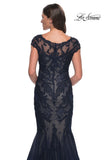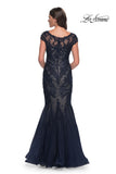 Long mother of the bride mermaid dress with cap sleeves and gorgeous lace. Illusion high neckline with lace detail along the top. Back zipper closure.