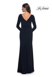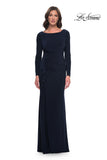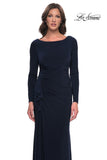 Simple chic jersey long dress with high neckline and long sleeves. The gown features ruching and a ruffle detail on the skirt. Back zipper closure.