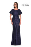 Gorgeous sequin evening dress with ruching at the waist and dolman sleeves. Back zipper closure.