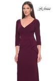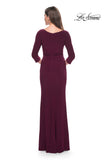 Jersey long evening dress with ruffle detail on the hip. V neckline and ruching. Back zipper closure.