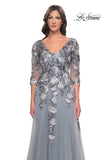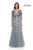 A-line tulle gown with embroidered lace applique on the top and cascading down the skirt. V neckline and sheer three quarter sleeves. Back zipper closure.