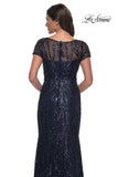 Long beaded print gown with stunning design. Sheer illusion high neckline and short sleeves. Back zipper closure.
