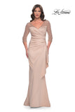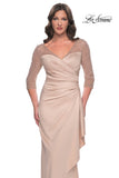 Ruched satin mother of the bride dress with ruffle detail on the skirt. Three quarter sleeves with beaded detail. Back zipper closure.