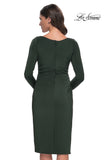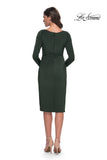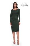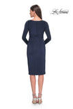Knee length chic jersey dress with ruching and long sleeves. Back zipper closure.