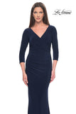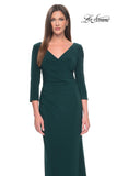 Wrap style long jersey dress with V neckline and ruching. Back zipper closure.
