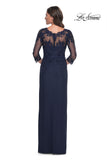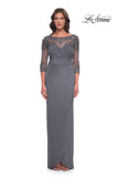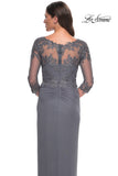 Net jersey dress with ruching and tulip style skirt. The top features a high illusion neckline and lace details. Back zipper closure.