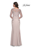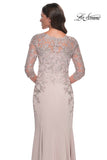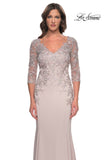 Long mother of the bride satin dress with V neckline and lace applique. Three quarter illusion sleeves. Back zipper closure.