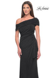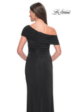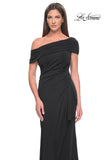 Unique evening gown with ruffle detail on the skirt. The top features an asymmetrical one shoulder sleeve. Back zipper closure.