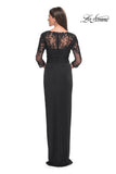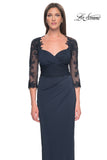Chic long stretch jersey evening dress with ruching on the top and waist. The skirt features a tulip style hem and the three quarter sleeves are sheer with lace. Back zipper closure.