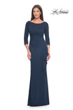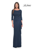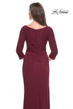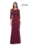 Long jersey dress with high neckline, three quarter sleeves, and ruffle detail at the hip. Back zipper closure.