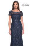 Gorgeous long mother of the bride dress with vintage style beaded design and short sleeves. The top features a sheer high neckline. Back zipper closure.