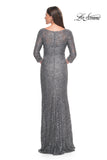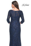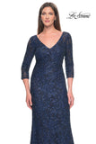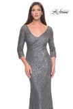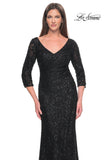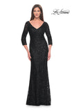 Beautiful fitted stretch beaded lace evening gown with flattering side ruching. The dress features a V neckline and three quarter sleeves. Back zipper closure.