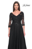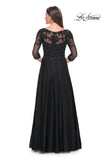 Flattering black evening dress with tulle skirt and rhinestones throughout the gown. The dress features illusion three quarter sleeves and beautiful beaded sequin lace applique. Back zipper closure.