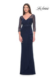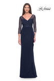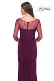 Flattering long jersey dress with rhinestone embellished bodice and sheer sleeves. Ruffle detail at the skirt and ruching at the waist. Back zipper closure.