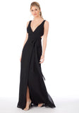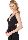 Chiffon wrap bridesmaid dress with side cutouts and deep v-neck.