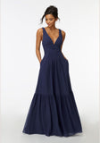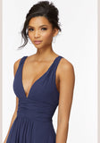 Chiffon bridesmaid dress featuring a deep-v neckline and ruched waist to enhance your shape and the straps converge to create a v-shaped back.