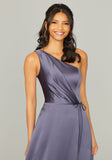 Statuesque bridesmaid dress in luminous silky satin with a front skirt slit and tied waist detail. The draped satin adds gorgeous texture to the one-shoulder bodice.