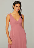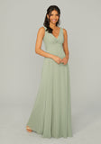 Chiffon bridesmaid dress features a v-neckline with a unique knotted bodice detail.