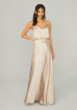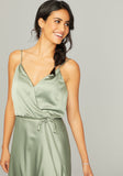 Luxe silky satin bridesmaid dress with a v-neck, surplice bodice and tied waist detail to define your figure.