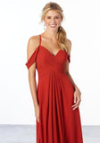 A-line chiffon bridesmaid dress with a ruched bodice, cold-shoulder sleeve, and crossing strap back detail. Shown in Cinnamon. View Chiffon swatch card for all available colors.