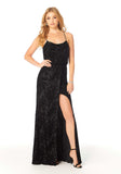 Luxe floral velvet bridesmaid dress features a cowl neck bodice with dainty spaghetti straps that cross in the back and a sultry front skirt slit. Shown in Black. View swatch card for all available colors.
