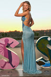 Butterfly bugle beaded gown with beaded embellishments, high slit, and open back.