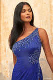 One shoulder bugle beaded gown with high slit, and beaded embellishments.
