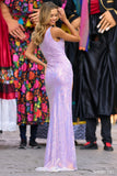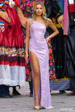 One shoulder sequin lace fitted gown with high slit on the side.