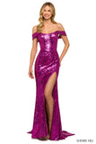 Machine sequin gown with corset bodice, detachable off the shoulder sleeves, and high slit.