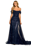 Sequin gown with corset bodice, off the shoulder sleeves, and removable skirt.