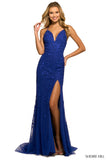 Leaf lace gown with plunging deep V neckline, lace up back, and skirt slit.