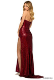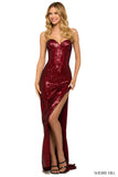 Sequin strapless gown with corset bodice and side slit.