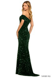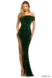One shoulder velvet sequin gown with high side slit and off the shoulder sleeve.