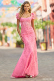 Leaf lace gown with scoop neckline, corset sheer bodice and ballon sleeves.