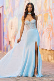 Strapless pearl beaded sheer corset bodice with rhinestone choker followed by a cape and scuba skirt slit.