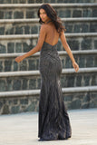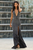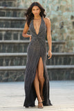 Sherri Hill 55577 Halter hot fix gown with deep V-Neckline, open back and skirt slit.