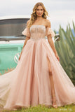 Strapless pearl beaded corset gown with organza skirt slit and removable ballon sleeves.