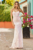 Strapless fitted sheer corset sequin and lace gown with an open back.