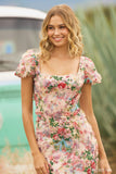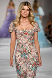 Fitted floral print gown with floral beaded embellishments, corset boning and ballon cap sleeves.