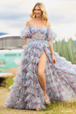 Tulle floral print gown with sheer corset bodice, ballon sleeves, ruffle embellishments and high skirt slit.