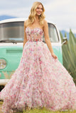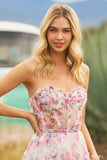Strapless floral tulle print ball gown with ruffle embellishments and sheer corset bodice.
